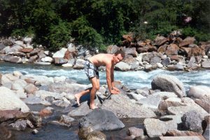 Het uitzicht is adembenemend. Je kijkt uit over het het hele dal omringt met besneeuwde toppen.Met klapperende kuiten begint de terugtocht. Elk jaar moeten we weer wennen aan het stijgen en dalen. Onderweg verzamelt Tanja bloemen om te drogen, aangezien er dit jaar niet veel te ontdekken valt op stenengebied. Veel te vroeg zijn we weer terug op de warme camping. We pakken de auto en strijken ergens lang een verkoelend beekje neer. Ondertussen zoeken we in winkeltjes die we passeren naar einen Windschutz oftewel een windscherm om bij het koken de gasjes uit de wind te houden. Uiteindelijk eindigen we met een rieten strandmat (wat een strandmat in Zwitserland zoekt is mij nog steeds niet duidelijk…) Met wat stokken en wat touw is daar wel een windscherm van te maken. Met een heerlijke barbecue sluiten we de dag af op 1800 meter en een heel koude nacht voor de boeg.