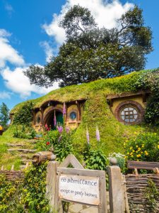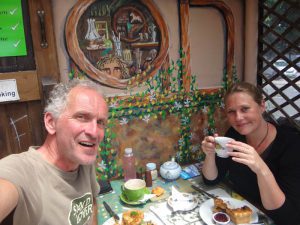 Over het algemeen is het een goede gewoonte om de top toeristenattracties van een land met de nodige voorzichtigheid te bekijken. In Nederland hebben we het bijvoorbeeld over Volendam, de Keukenhof of de Wallen. Drie attracties die wat mij betreft exemplarisch zijn voor te vermijden tijdsverdrijven. Daarom is het met enige achterdocht dat Hobbiton (nummer twee attractie in aantal bezoekers) in ogenschouw genomen werd. Maar gisteren heeft het enthousiasme van Patricia en Jan-Bert over deze activiteit mijn achterdocht doen verdampen. Dus zijn we op weg naar de filmset van zowel The Hobbit als Lord of the Rings. Het had nogal wat voeten in aarde om er binnen te komen, want vooraf boeken bleek noodzakelijk en dat hadden we niet gedaan. Om 11 uur ’s avonds wordt er druk gezocht op internet naar een mogelijkheid en verrassend genoeg blijkt er nog een optie. Als we namelijk niet bij de attractie starten maar in een plaatsje zo’n twintig kilometer verder op, krijgen we een gratis transfer maar vooral: is er nog plaats. Het business model van deze constructie wordt mij niet duidelijk maar zoals mijn moeder vroeger zei: vraag niet hoe het kan, profiteer ervan!
