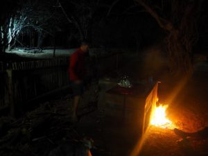 ’s Avond barbecue van braaimaster Rob met een meter boerenwors en een kip met een blikje bier in z’n gat. Ondanks dat het de nodige creativiteit vraagt om het vlees gereed voor consumptie te maken is het een heerlijke etentje bij een gezellig knapperend haardvuurtje. Als we klaar zijn komt er een zwevend kunstgebitje aan. Het is de altijd lachende en uitermate beleefde Bravo, de beveiliger. Hij stelde zich voor als de ultieme reden om je schouders los te gooien, de spanningen uit je nek weg te laten vloeien en in een volkomen staat van Zen te geraken want Bravo is here, dat wordt weer lekker slapen.