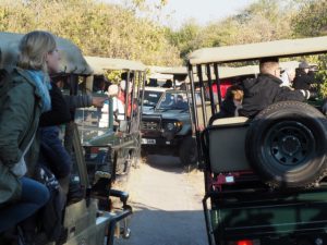 Een paar jonge mannetjes zijn al wat meer wakker en zijn bezig met een schijngevecht waardoor het gebit van de heren duidelijk zichtbaar wordt, respectabele tandjes! We sluiten weer achteraan in de file en gaan verder. Er is niet veel wild te zien en volgens de gids is dat te danken aan het jagen van leeuwen. Als bewijs wijst hij op een paar putjes in het zand die leeuwensporen zouden zijn. Gids King haalt voorgangers in waar mogelijk. Waarom is ons geheel onduidelijk en het effect is slechts dat we een andere voorganger voor ons krijgen. Hij overlegt met iedere andere gids en wat zich wel steeds duidelijker aftekent is dat iedereen op zoek is naar de grote katten. Hij roept een paar keer dat hij ze kan horen, wuift een beetje naar dichte bebossing dat ze daar echt rondlopen maar de King of the Jungle laat zich door de King of the (dirt)Road niet verleiden tot een vertoning. Dan maar naar de koffie en theebreak. We komen aan op een plek waar zich intussen een vijftal andere jeeps hebben verzameld en de thermoskannen worden tevoorschijn getrokken. Dan komt de marifoon in verschillende auto’s krakend tot leven en worden we als vee de safari jeep ingejaagd om aan de oproep gehoor te geven. King haalt op zijn meest a-sociaals andere jeeps in en zo kan het gebeuren dat we als laatste vertrekken maar als tweede bij de voorstelling aankomen. Voor ons sjokt er een grote mannetjesleeuw over het pad en trekt zich totaal niets aan van de aanzwellende hoeveelheid safari jeeps die hem achtervolgen. Als er ook nog eens aan de andere kant van het pad in de struiken 2 mannetjesleeuwen worden gesignaleerd is het hek van de dam. Van de andere kant komt ook nog een kudde safari jeeps aan gedenderd en met zeker 12 jeeps staan we op een zandpad met z’n allen shocking klem. Geen leeuw meer te zien (geef ze eens ongelijk) maar voor of achteruit kunnen we ook niet meer. Na een overdosis bijzondere verrichtingen waarbij King zich ook als medewerker van de plantsoenendienst ontpopt weten we te ontsnappen uit de wurggreep van deze safarigekte. We rijden terug naar de poort en eigenlijk wordt het dan pas mooi. Vechtende olifanten, mangoesten, giraffen, ze