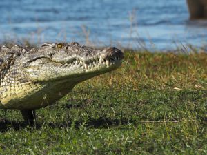 Een paar uur later melden we ons bij een boot voor een riviercruise op de Chobe in de hoop dat het daar wat relaxter aan toe gaat. De hoop zinkt ons in de schoenen als de kapitein zich aandient: King! Blijkbaar is de man van alle markten thuis. Maar gelukkig geldt ook in Botswana dat het leven op het water zich altijd een tandje rustiger afspeelt. Hij heeft nog wel steeds de neiging om iets meer gas te geven als zijn buurman maar we schieten gelukkig niet in plané over het water. Op een eiland in de grensrivier tussen Botswana en Namibië staan twee olifanten te headbangen met een pluk gras in hun slurf. Beetje raar gedrag maar het blijkt dat ze de modder van de wortels af willen slaan om hun gebit te sparen. Verder op staan trouwens enorme kuddes olifanten hetzelfde te doen. Dit blijken twee vrijgezellen heren die door dames olifanten de deur zijn gewezen. Een enorme krokodil wordt door King voorgesteld als Mr. Croc, made in China.