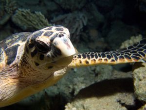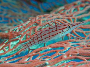 De duiken op de riffen van de Straat van Tiran zijn zeer de moeite waard. Soms weet je niet waar je het eerst naar wilt kijken. We vallen achterover van de zodiac, dalen af en komen bij een nogal lomp lunchende schildpad terecht terwijl achter ons een reuzenkogelvis sloom op het zand ligt. Boven ons schieten 4 kleppers van tonijnen door het water en vanuit de diepte komt een grote Napoleon poolshoogte nemen, kortom je komt ogen te kort. Tot mijn groot genoegen komen we ook heel veel spitsnuitkoraalklimmers tegen. Een klein onderdeurtje van een vis die zich omhoog gewerkt heeft tot één van mijn favoriete vissen want zeg nou zelf: als je zo mooi rood en wit gekleurd bent, met een patroon waar je boter kaas en eieren op kunt spelen, je hebt een gorgoon als huis én je mag 24 uur per dag duiken, dan heb je toch goed opgelet tijdens de evolutie.