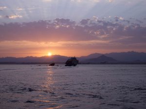 Aan het einde van de dag gaan we op weg naar een ankerplaats voor de nachtduik en komen in een school dolfijnen terecht van zeker 100 dolfijnen. Overal om de boot heen springen ze uit het water. Voor de boeg laat een groepje zich voorstuwen door de boeggolf. Ze blijven zeker een kwartier ronddartelen voor ze vertrekken. Als ze uiteindelijk vertrokken zijn wendt het schip de steven en zijn we precies op tijd om de mooiste zonsondergang van de hele vakantie te aanschouwen. De zon gaat bloedrood onder terwijl het laatste licht over het wrak van de Louillia strijkt dat moedig stand houdt boven op het rif. Betoverend.