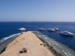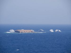 Na de duik is het tijd voor beraad. De weersvoorspellingen zijn niet best. Zon, dat gaat lukken, 30° Celsius ook nog, maar de wind baart de kapitein zorgen. Windkracht 5 tot 6 wordt er over twee dagen voorspeldt en dat is teveel. De planning voor deze trip was om twee afgelegen riffen, ver op zee te bezoeken. De kapitein heeft ernstige bedenkingen of we beide kunnen doen en dus wordt er na overleg een alternatief bedacht. Deadelusreef gaat niets worden, Brothers wel. Als alternatief vragen we of het mogelijk is om naar de Straat van Tiran te gaan, een riffensysteem tussen de Sinaï en Saoedi Arabië. De kustwacht wordt gebeld, het hoofdkantoor geraadpleegd en uiteindelijk komt de toestemming. Jammer van Deadalus maar veiligheid gaat voor alles. Meteen na het besluit wordt de boot klaargemaakt voor de overtocht naar de Sinaï. Zeven uur luieren, slapen of lezen. Ondanks een stevige golfslag schieten we lekker op en rond een uur of 5 komen we aan bij Ras Mohammed, het uiterste puntje van de Sinaï. We varen voorbij Sharm El Sheik en ankeren bij Gordon Reef, één van de vier riffen die keurig op een rij de Straat van Tiran blokkeren. Dat ze erg in de weg liggen voor de scheepvaart mag blijken uit het feit dat twee riffen gekroond zijn met een wrak dat zich te pletter heeft gevaren tegen het rif.
