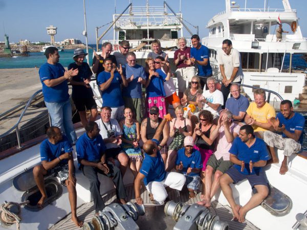 Terug op de boot is het tijd om spullen te spoelen, te drogen te hangen en tassen in te pakken. We gaan op weg naar Hurghada en in de haven is het moment voor de grote groepsfoto. Iedereen wordt naar het voordek gemanoeuvreerd en behalve dat er op voorstel van Sonja nog een keer of drie gezongen wordt voor de jarige, verwordt de groepsfoto al snel in een concert met als hoogtepunt het volkslied van de Gejo vakantie 2011: van voor naar achter, van links naar rechts met als enige rots in de branding Rob! Die laat zich niet gek maken en houdt de rug recht… Het laatste diner wordt een afscheidt van de kok. Die staat zenuwachtig achter zijn luikje te loeren. Bijna vergeet Sonja het en pas na een opmerking van Glenn kan hij zijn enkele, door de zon gebruinde tanden bloot lachen: de verjaardagstaart. In de vorm van een dolfijn of haai en met de kaarsje in verkeerde volgorde erop. Een grap die hij de komend jaren niet meer kan maken zonder dat het of geen enkel effect heeft of waarschijnlijk nog minder tanden oplevert. Prachtig is ook het diepgemeende Habby Birthday. Dus nog maar een keer gezongen (Tanja kijkt vanaf nu wel uit om mee te gaan tijdens haar verjaardag)