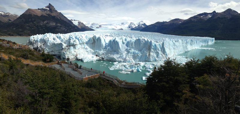 Na twee dagen lekker zelf onze ontbijtjes te hebben geregeld zijn we nu aangewezen op de eetschuur van hotel Kaleshen in el Calafate en dat valt nog niet echt mee. Esther had een cake-achtige met een prachtige blauwschimmel. Voor (banket)bakkers is hier in Argentinië nog een wereld te winnen. De tafels worden niet afgeruimd en het buffet niet aangevuld. Maar goed, het weer is heel erg mooi en ons humeur niet kapot te krijgen. We gaan naar El Perito Moreno, een uitloper van een enorme gletsjer op zo’n 80 kilometer afstand van el Calafate. Wat een prachtig beeld als je daarop aan komt rijden! Ondanks dat het niet top-hoogseizoen is, staan de miradors toch vol met busladingen senioren. Ons was geadviseerd om de noordkant te bekijken en dat bleek een prima keuze. We kochten snel kaarten voor de boot die ons erlangs ging varen en na een snel kopje koffie kozen we het ruime sop. De boot was afgeladen vol en voor we vertrokken kregen we een volledig onverstaanbaar praatje, dat zelfs in het Engels niet te volgen was. We moesten allemaal onderdeks blijven uit veiligheidsoverwegingen, het hoe en waarom was tamelijk onduidelijk. Toen we eindelijk naar het dek mochten was het daar wel heel erg druk. Eigenlijk was de wandeling die we daarna langs de gletsjer maakte de betere keuze, het beeld was mooier en je kreeg niet elke keer een hap haar in je mond van iemand die, zonder om zich heen te kijken, een stap achteruit deed om dé ultieme foto te maken. De wandeling was in kleurtjes ingedeeld, een beetje zoals de Jostiband zijn muziek organiseert. We begonnen met blauw, toen geel, rood, groen en toen waren we in de war. Hoe terug te gaan? Uiteindelijk gewoon precies zoals we waren gekomen: groen, rood, geel en tenslotte weer blauw. De gletsjer was indrukwekkend en er braken de hele tijd stukken af. Het geluid echode tegen de wand, waardoor het indrukwekkender klonk dan dat het in werkelijkheid was.