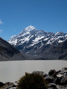 Okay, op pad dus maar. Wandelen in de bergen is altijd tof, of het nu bewolkt is of niet: bergbeekjes die uit rotspartijen tevoorschijn komen, vroege Helleborus met prachtige witte bloemen (overigens wel één van de weinige bloeiende planten nu) en af en toe een blik op een sneeuwveld. Zwitserland is qua bloemenpracht niet te overtreffen maar ik voel de Alpensfeer duimendik om me heen. Des te verder we komen des te meer bergen er uit de mist verschijnen. Als we een uur onderweg zijn lopen we in de stralende zon en heeft Mount Cook zich in al zijn pracht gemanifesteerd. Althans, dat denk ik. Marieke heeft het idee dat Mount Cook meer naar links en dus nog in de wolken verblijft. Moeilijk te ontkrachten want de berg voor ons is groot en machtig maar de pluk wolken links is nog groter en kan dus wellicht een nog hogere Alpenreus verbergen en geen van ons beide weet hoe hij eruit ziet. Het verlossende woord komt van een vernuftig apparaat dat boven op een rots is gemonteerd. Een ronde schijf waarop strepen staan die naar bergtoppen wijzen en als de je het ronddraaiend kijkglas er bovenop precies langs zo’n lijn legt kijk je zo naar de top in kwestie. En ja, het is Mount Cook, met zijn 3754 meter de hoogste top van Nieuw-Zeeland. Weg met die voorspellingen: hier staan we, terwijl de zon brandt op onze kop, te kijken naar een prachtige bergtop omringt door vele mede 3000-ers, ongehinderd door wolken of regen. Kortom: bofkontjes…