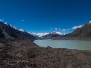 Terug in het dorp, na het verschalken van een gedeelde pizza als late lunch, rijden we door naar de Tasman gletjser. Een korte wandeling naar de top van de morene met uizicht op de gletsjer. Mount Cook is vanaf de andere kant te bewonderen maar ook de gletsjer is prachtig. Zorgwekkend is het informatiebord dat meldt dat de gletsjer zich met maximaal 800 meter per jaar terugtrekt. Ongetwijfeld spelen ook natuurlijke factoren een rol maar het feit dat de opwarming sneller gaat dan ooit van tevoren zou reden moeten zijn om op te houden met struisvogelpolitiek.