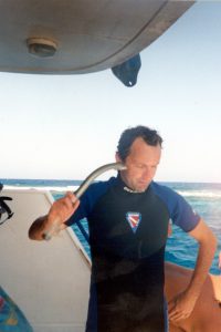 De zodiak heeft intussen aangelegd en wordt volgeladen met mensen en bagage. Heel rustig varen we tussen alle boten door, zorgvuldig de drijvende landvasten van andere boten ontwijkend met de buitenboordmotor en uiteindelijk zien we onze boot, helemaal achteraan liggen. We worden aan boord geholpen en kunnen ons huis voor de komende week bekijken. Het ziet er mooi uit, redelijk ruime hutten, die wel wat naar diesel stinken, een mooie grote salon en een mooi bovendek afgeschermd met zeil tegen de zon en voorop voor de stuurhut nog een zonnedek. De hutten worden verdeeld, de koffers uitgepakt en de duikspullen opgetuigd. p het achterdek is een rek waar alle flessen staan. Daar hang je je vest en inflator aan en onder het bankje gaat de rest van je spullen in een kratje. Een week duiken en geen gezeul met spullen. Hierna gaan we eten en dat is heerlijk, spaghetti met achterlijk veel knoflook, zo’n hoeveelheid waar het klamme zweet je van uitbreekt. Waarschijnlijk een soort van welkomsselectie; als je dit zonder morren overleeft, mag je mee. Mijn lijfspreuk is echter hoe knoffer, hoe toffer, dus ik zit gebakken. Na het eten volgt er een korte introductie van de boot door Andrea en daarna nog even op het bovendek een whisky;21 oktober 2001, in mijn korte broek, T-shirt, 10 uur ’s avonds: lekker buiten zitten terwijl de golfjes tegen de boeg kabbelen, mijn lief ligt tegen me aan, om me heen worden stoere verhalen vertelt over duiken, boven me fonkelen meer sterren dan je voor mogelijk houdt en in Nederland regent het….